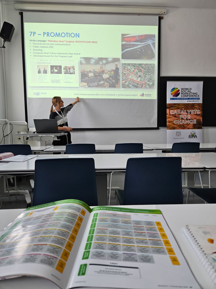 Tako kot na lanski 6. evropski konferenci socialnega marketinga, ki je potekala v Ljubljani, je tudi tokrat mag. Silva Nemeš predstavila aktivnosti Programa ozaveščanja in opolnomočenja o srčnem popuščanju, in sicer skozi prizmo socialnomarketinškega miksa. Soavtorica prispevka je bila doc. dr. Jerneja Farkaš Lainščak, strokovni vodja programa.